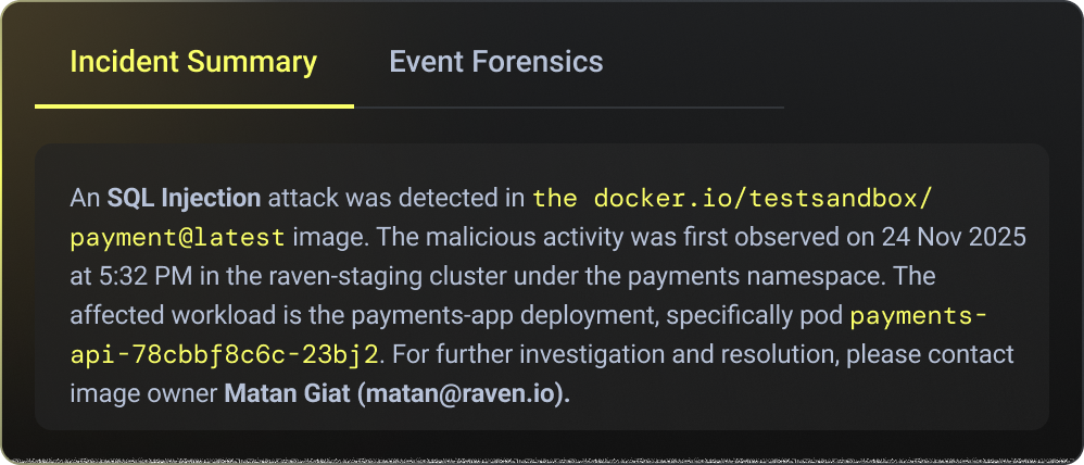 Raven detects SQL injection and database abuse from inside the application runtime, not from network patterns or query signatures. This is done by observing real execution paths, input flow, and query construction. This enables high-fidelity SQLi detection with full application context, even for dynamic or obfuscated queries, without regexes, payload guessing, or WAF false positives.